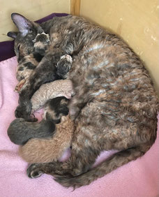 Unsere Daily hat uns ihren ersten Wurf geschenkt! Dafür hat sie den hübschen Zeppelin vom Hause Hamann besucht. Zeppelin ist ein Europäisch Kurzhaar Kater mit German Rex Genetik - seine Mama ist die berühmte German Rex Katze "European Stars Sophia" und über seinen Papa bringt er genetische Vielfalt und viele positive Attribute mit. Der Wurf besteht also aus German Rex Babies und aus Europäisch Kurzhaar Babies mit 75% German Rex Anteil.