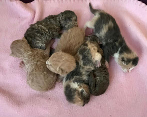 Daily hat uns mit ihrem ersten Wurf gleich 6 Babies geschenkt. SIe hat die anstrengende Geburt ganz prima gemeistert und auch die kleine Emma hat ihre Arbeit als Hebamme sehr ernst genommen und hilft weiterhin bei der Pflege. Wir freuen uns über diesen hübschen und vielfältigen Wurf. Vater des Wurfs ist der tolle Europäerkater IC Zeppelin vom Hause Hamann. Wir haben 3 German Rex Babies (1 Mädel, 2 Jungs) und 3 Europäisch Kurzhaar (German Rex Hybriden) Babies (3 Mädels).
